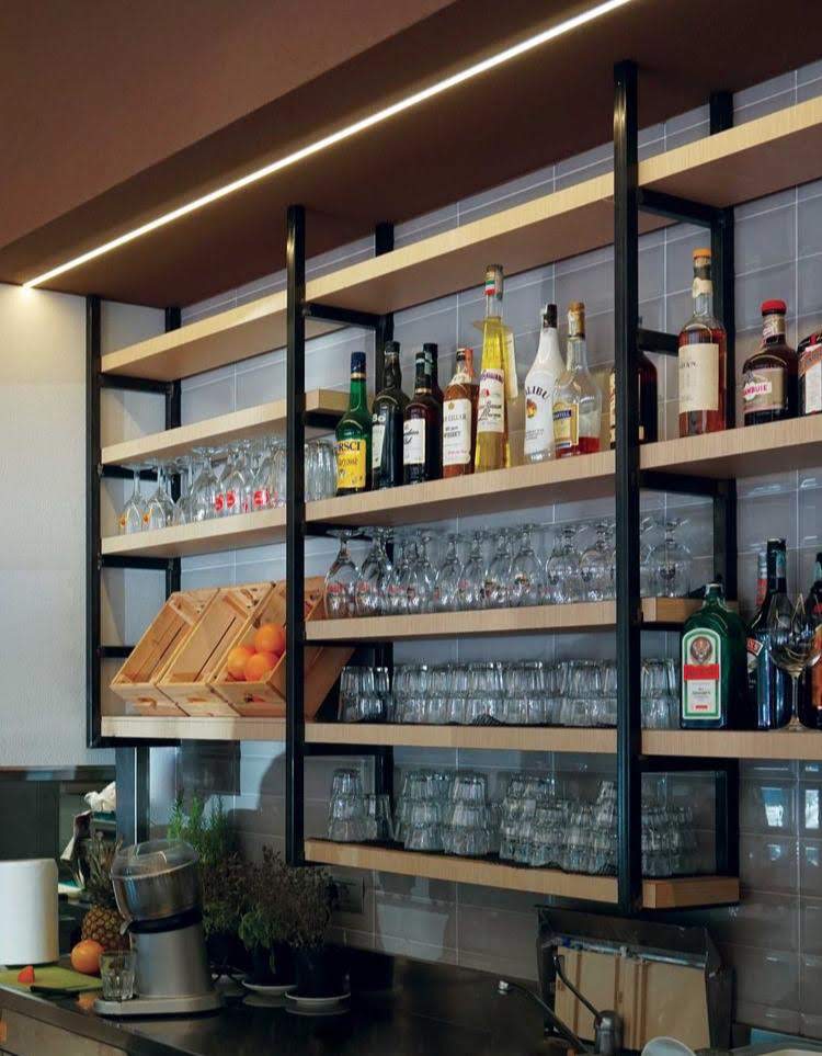 - Botellero cuelga copas descolgado de techo sobre barra.