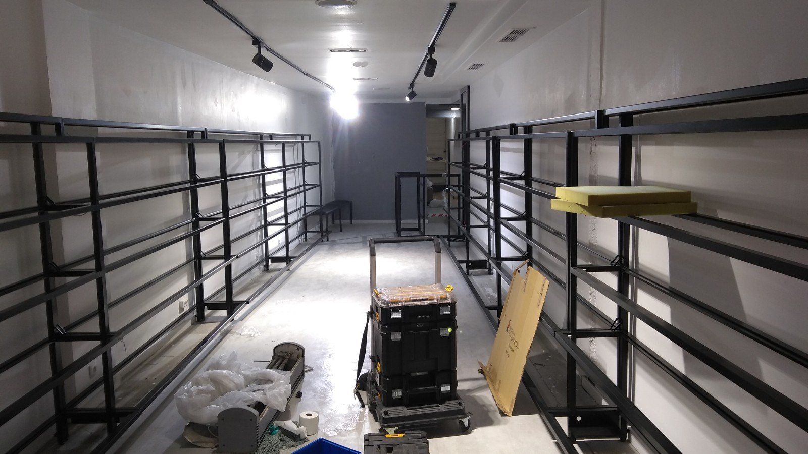 - Estanteriás de hierro con lejas de vidrio enrasadas, y alojamientos para leds y fuentes de alimentación.