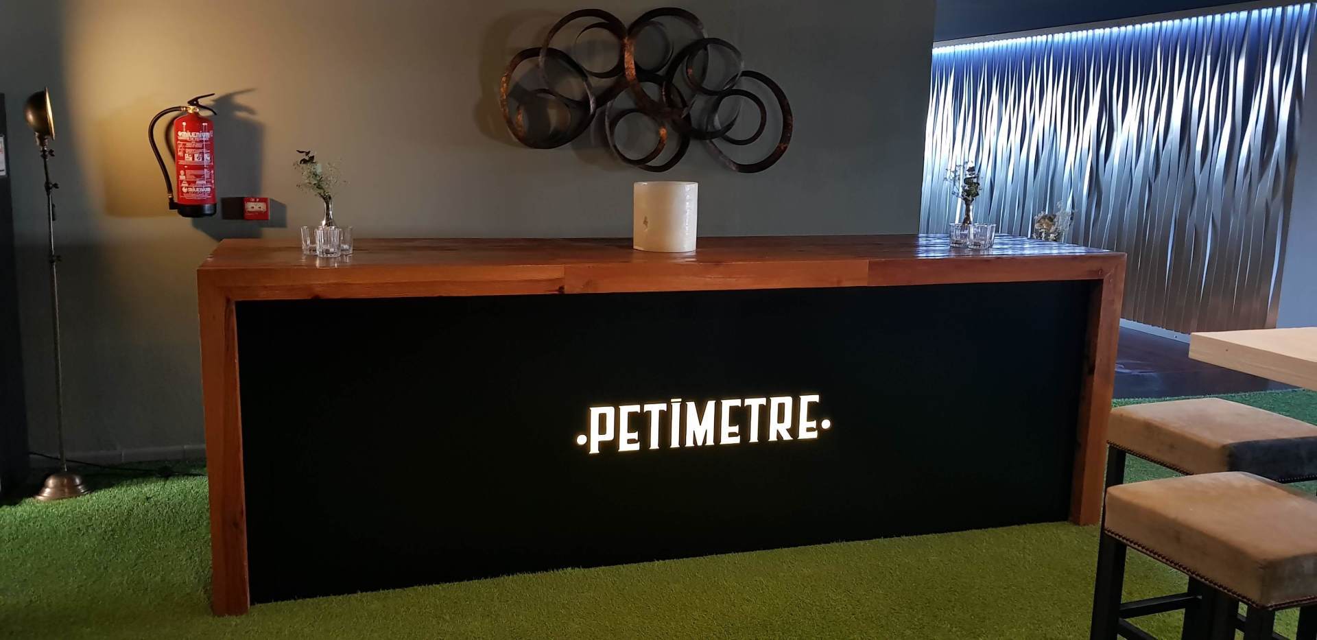 - Mostrador recepción con nombre cortado a laser y metraquilato enrasado e iluminado.