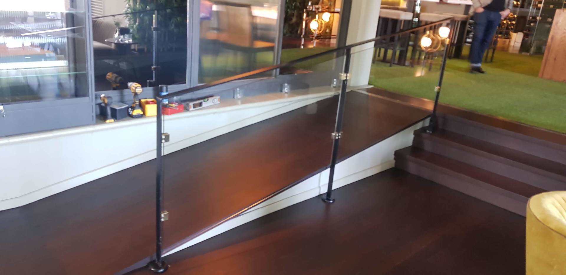 - Barandilla la cada negro con pinzas en oro y vidrio de seguridad.